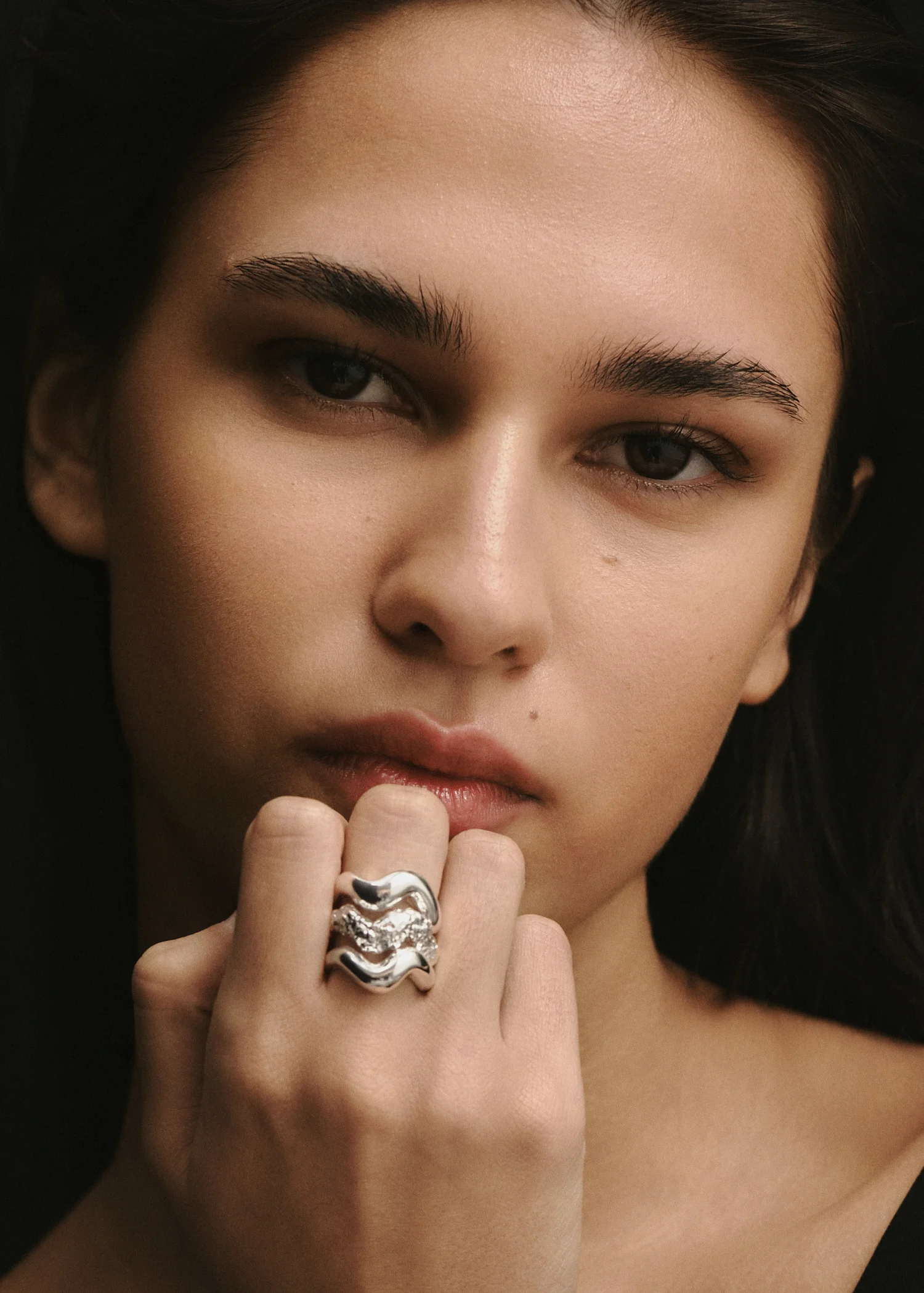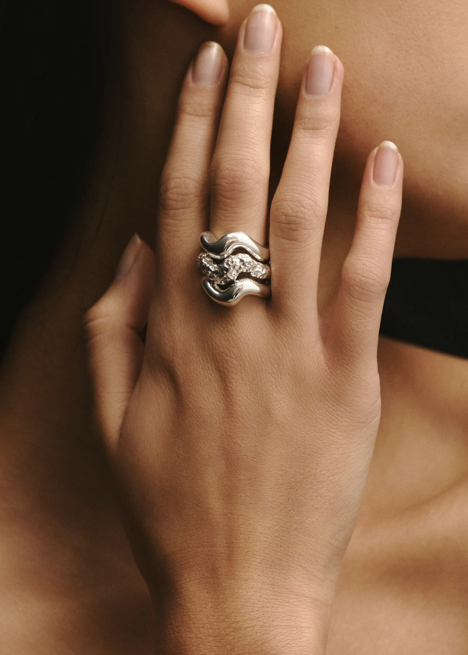 A set featuring one Aurea` Ring and two Aurea` Polished Rings. Each ring is handcrafted from recycled sterling silver & shaped into a slightly curvy shape. Exclusively priced as a set.