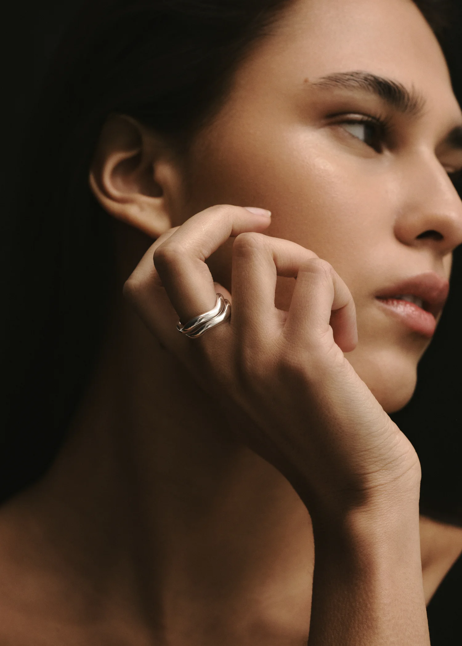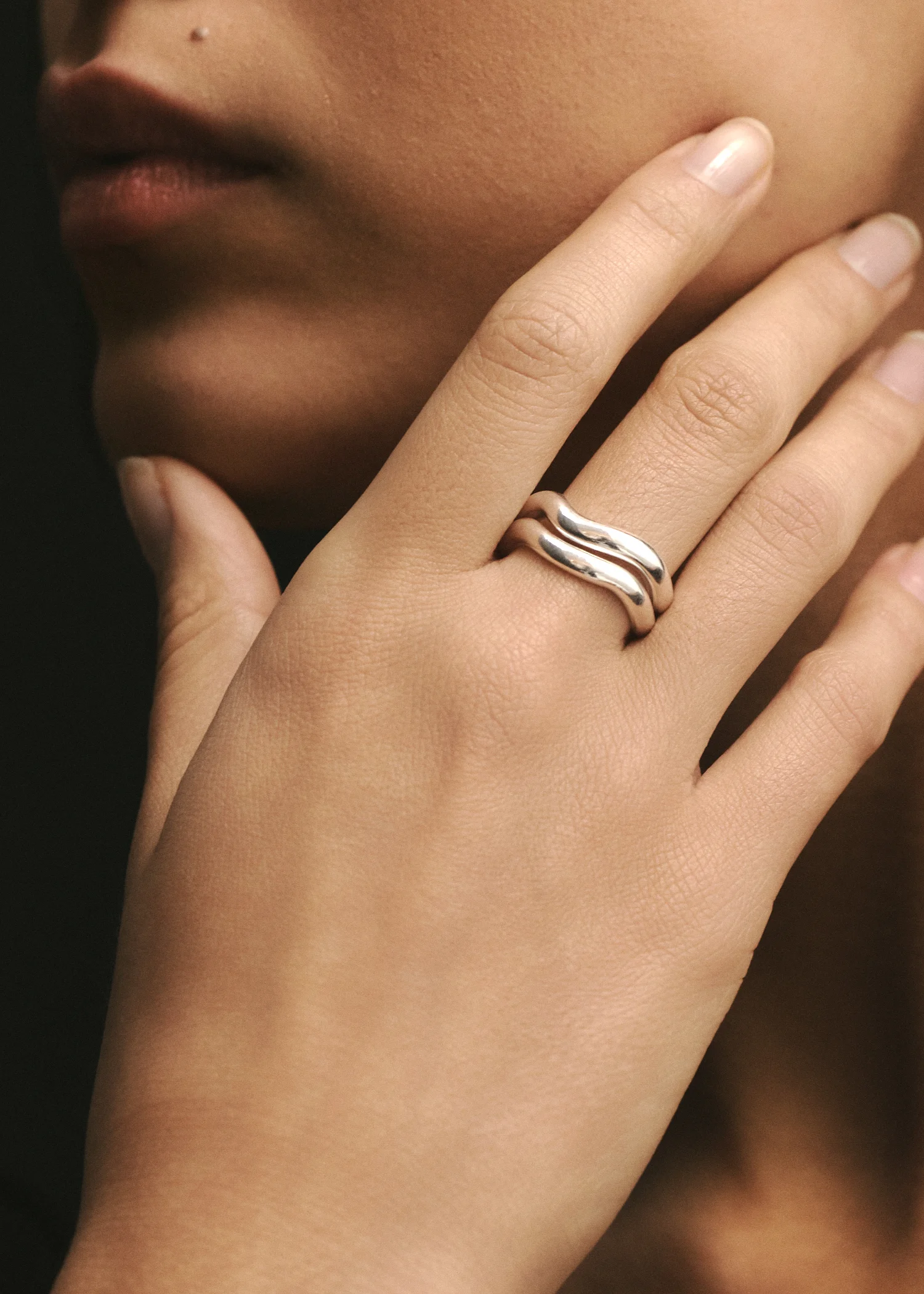 A set featuring two Aurea` Polished Thin Rings. Each ring is handcrafted from recycled sterling silver & shaped into a slightly curvy shape. Exclusively priced as a set.