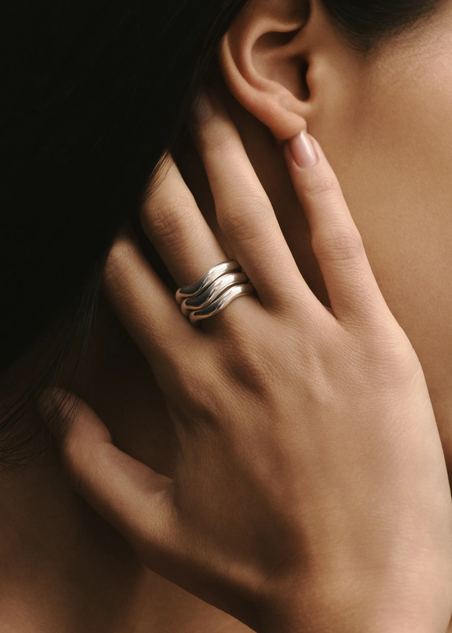 A set featuring three Aurea` Polished Thin Rings. Each ring is handcrafted from recycled sterling silver & shaped into a slightly curvy shape. Exclusively priced as a set.