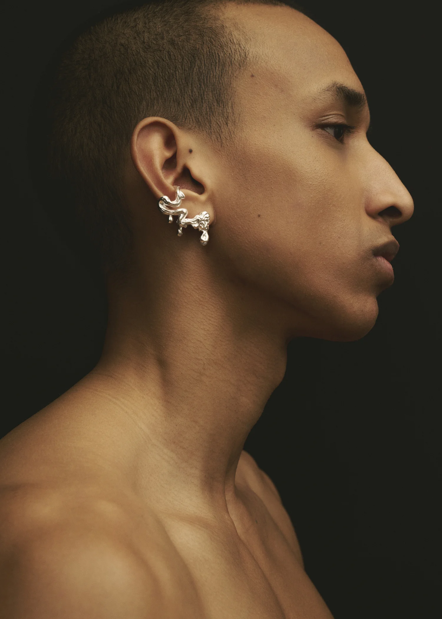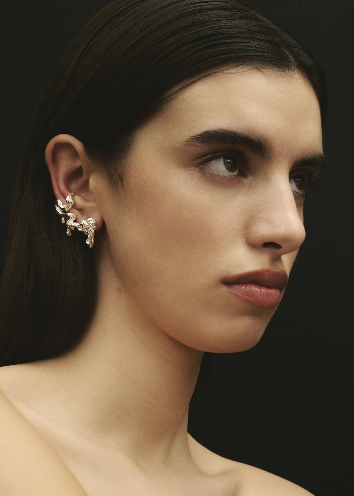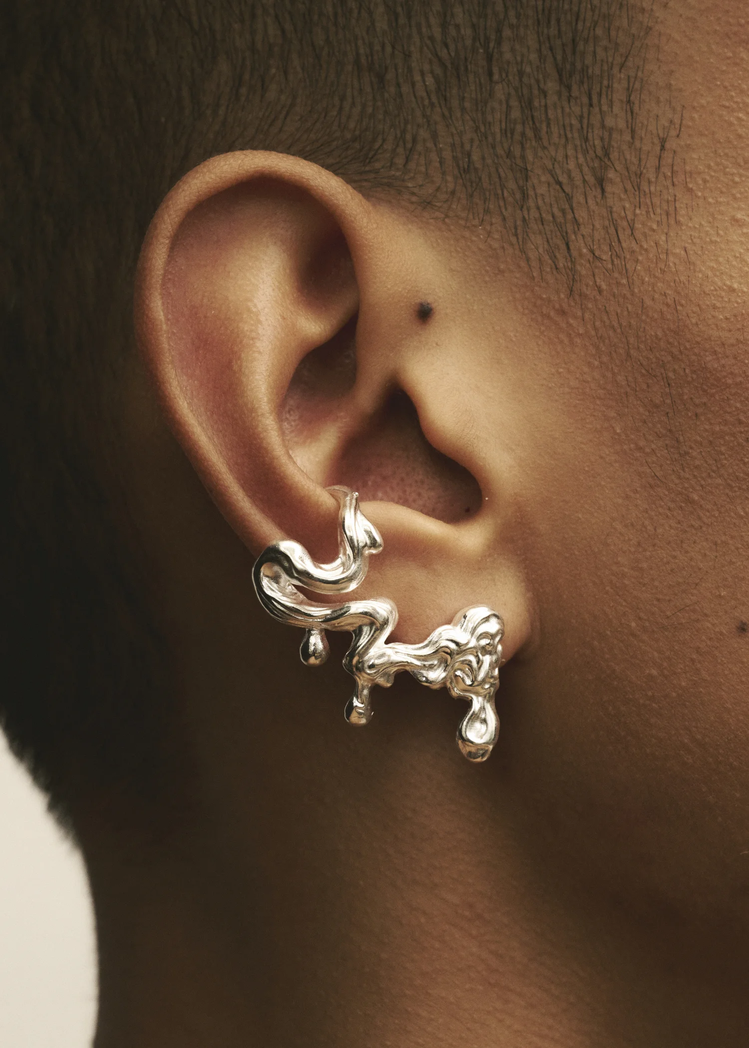 Introducing the Umor Ear Climber, a fusion between an earring and an ear cuff coiling around the ear creating a liquid-like aesthetic. This Earring is sold as single and is the designed for wear on the right ear.