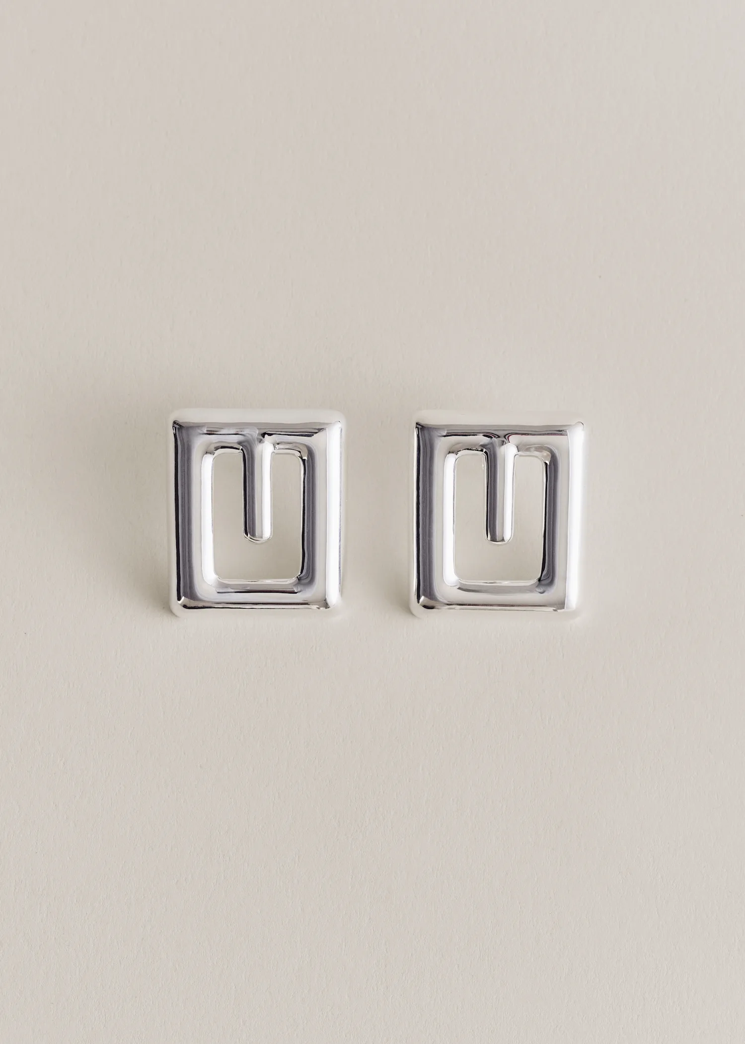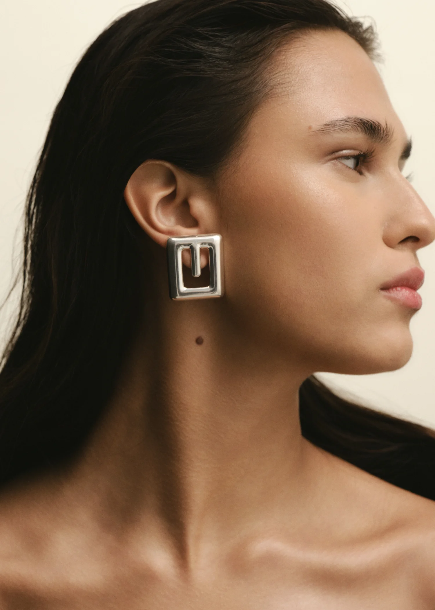 Discover the Zona Earrings, inspired by the classic belt buckle. These statement silver pieces add a sleek touch to any outfit.